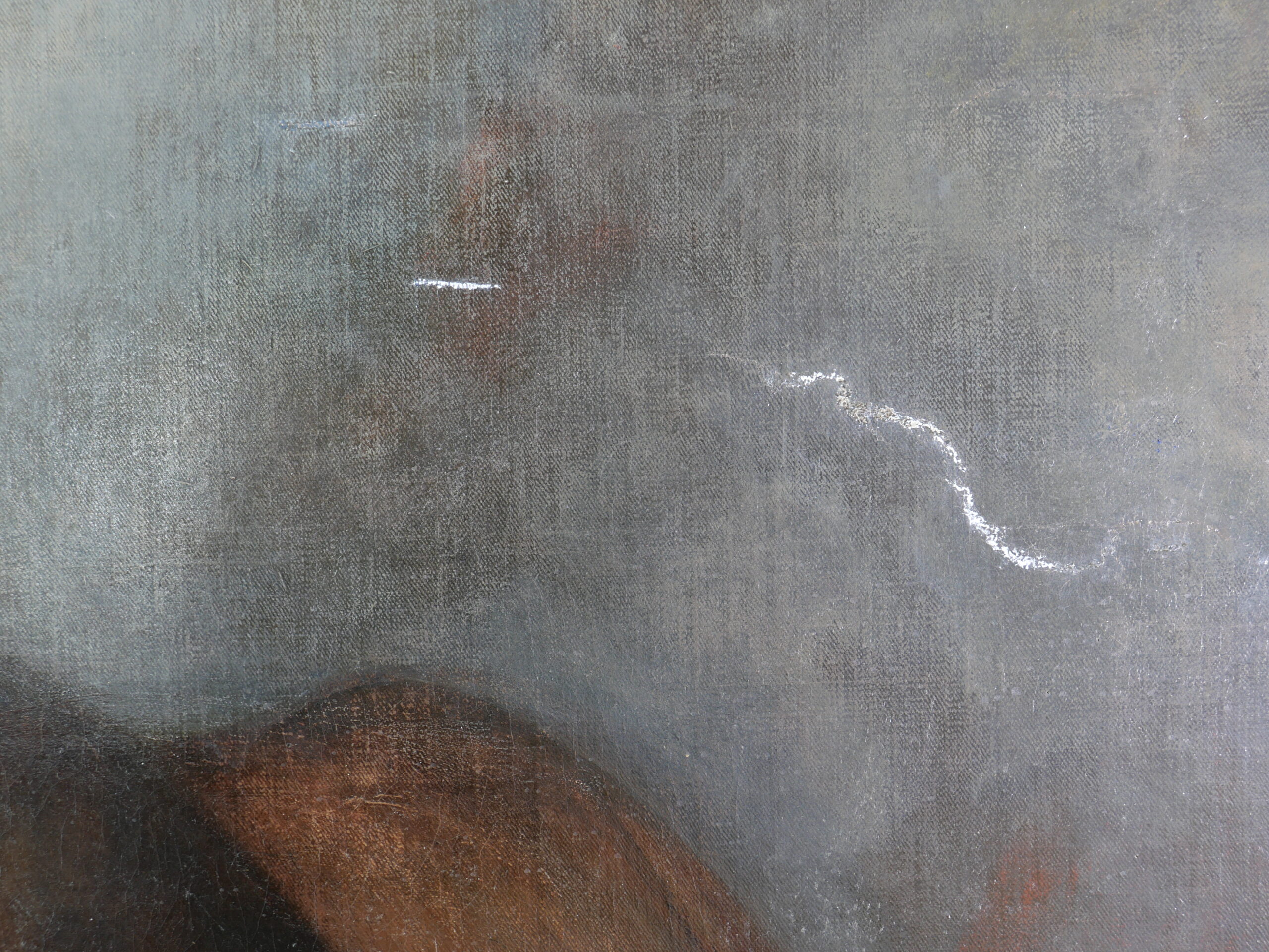 We identified flaking paint, old tears, surface staining (possibly from food and pollution), embedded debris, canvas distortions, and a discoloured varnish. The edge showed corroded tacking margins and trapped screws causing protrusions and paint loss. And finally, the two joint stretchers colliding with the wall fixture was changing the shape of the stretcher.