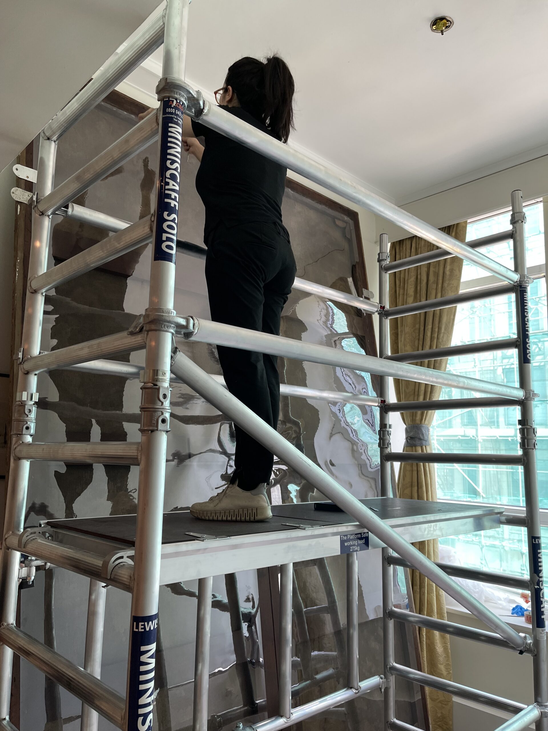 To safely support the monumental canvas, we created a two-part, U-shaped custom frame system. This allowed secure mounting using nylon webbing and stainless-steel mending plates — ensuring safety without compromising the artwork.